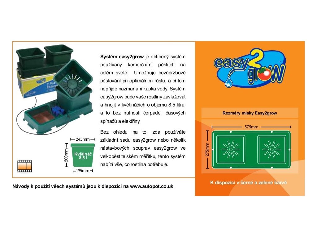 Pasivní závlahový systém Autopot Easy2grow Kit se 2 květináči a 47 litrovou nádrží obsahuje v balení také kompletní příslušenství. Systém lze jednoduše rozšířit o dva a více květináčů v sudém počtu.