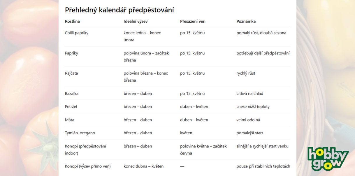 S příchodem konce zimy začíná pro pěstitele jedno z nejdůležitějších období celého roku - předpěstování. Správné načasování výsevu má zásadní vliv na zdraví, velikost i konečný výnos rostlin. Pokud začnete příliš brzy, rostliny se vytahují a slábnou. Pokud naopak pozdě, nestihnou naplno využít venkovní sezonu.