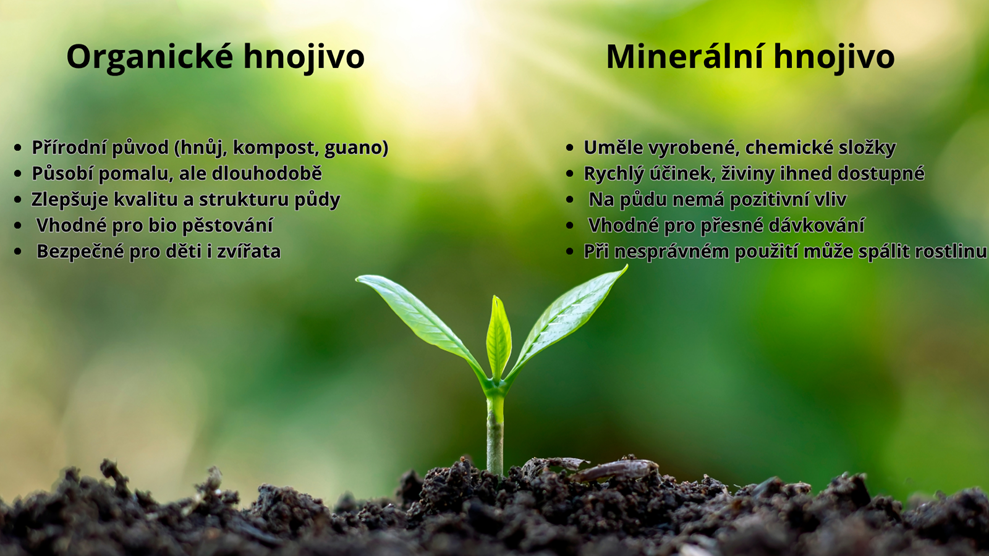 Hlavní rozdíl mezi minerálním a organickým hnojivem je: