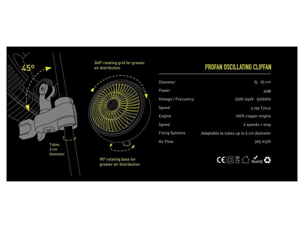 Klipsnový ventilátor PROFAN - 25 cm/20 W má výkonný magnetický motor s maximální rychlostí 2100 otáček za minutu a průměrný průtok vzduchu 425 metrů krychlových za hodinu. Ventilátor s velmi nízkou spotřebou umožňuje cirkulaci vzduchu v uzavřených prostorách. Ventilátor s klipsnou PROFAN - 25 cm/20 W je vhodným doplňkem všech typů pěstebních stanů, nejen PROBOXů. V tropických letních měsících přináší vítané osvěžení do pokojů, kanceláří nebo průmyslových provozů.