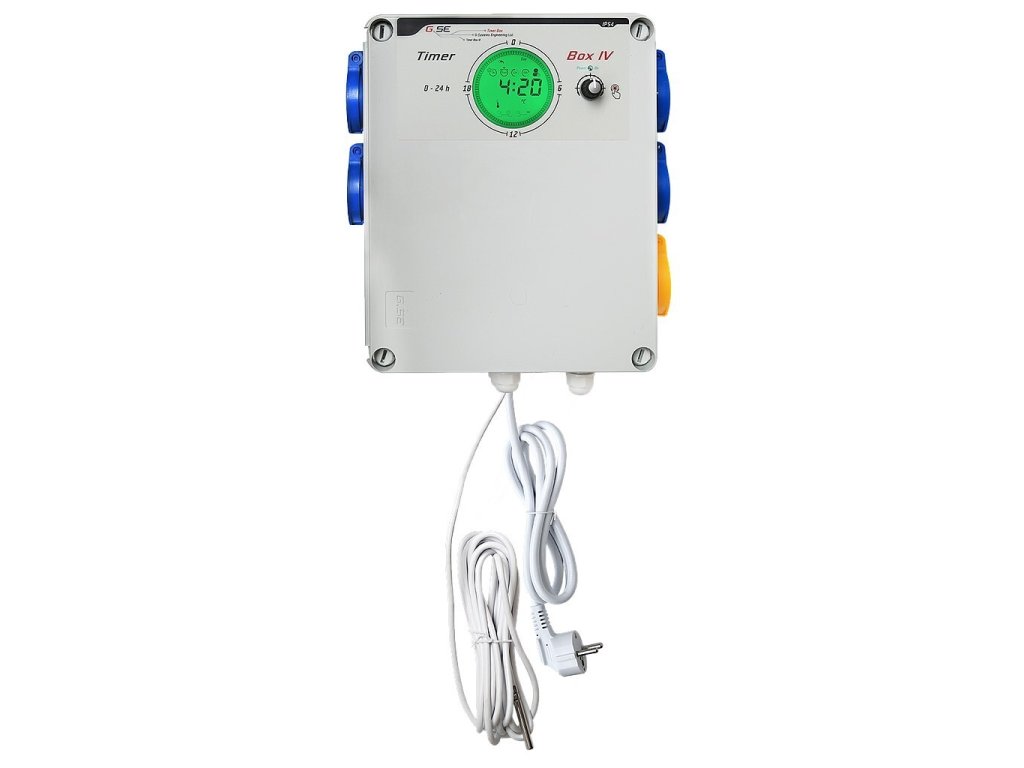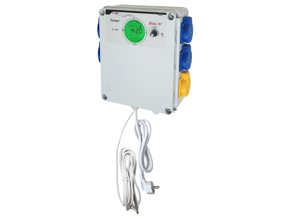 GSE Timer Box IV 4x600W se používá ke spínání několika indukčních zátěží, jako jsou vysokotlaké výbojky s vysokým zapínacím proudem, aby se zapínaly a vypínaly současně. Timer box IV má digitální displej, který je založen na 24hodinovém mechanickém časovači. Díky stisknutí tlačítka doleva / doprava je nastavení hodin ještě rychlejší než u klasického mechanického spínače. Až 48 displejových segmentů ukazují aktuální čas a naprogramovanou dobu trvání.