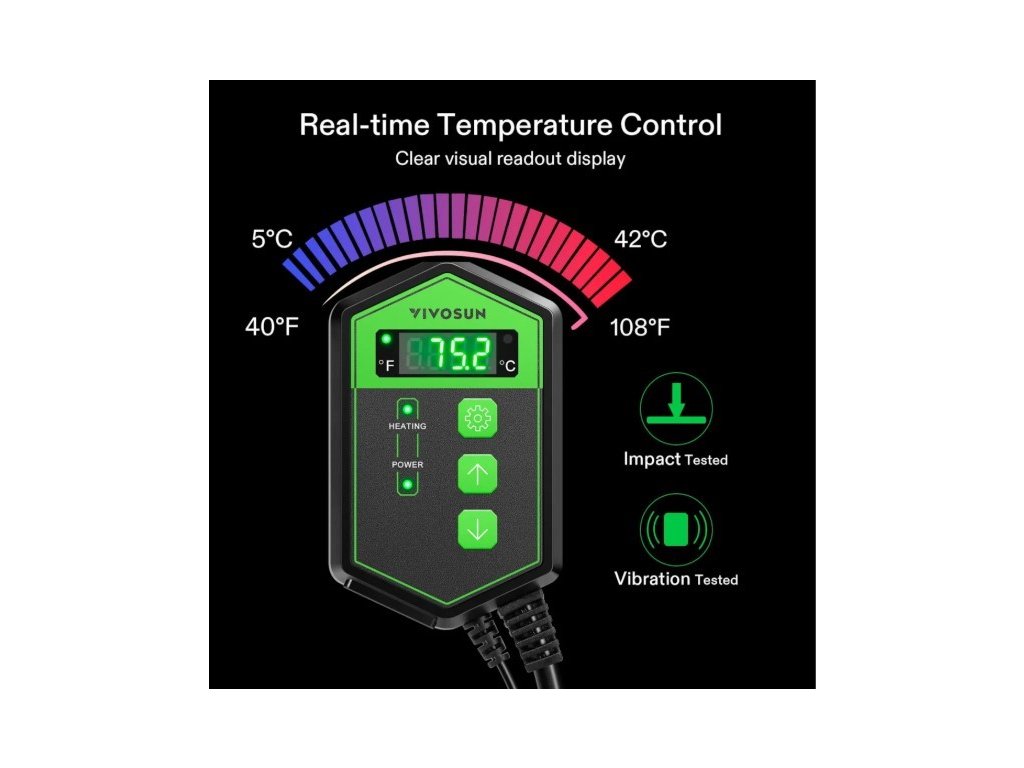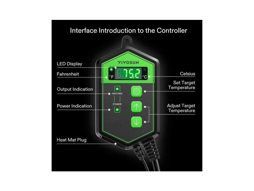 Termostat je vhodný pro pěstitele, kteří používají topné rohože bez integrované regulace nebo potřebují nahradit poškozený či chybějící regulátor. Je kompatibilní se všemi topnými rohožkami VIVOSUN i s produkty jiných výrobců v rámci povoleného výkonového rozsahu. Konstrukce je navržena pro nepřetržitý provoz během celého procesu klíčení a raných fází růstu.