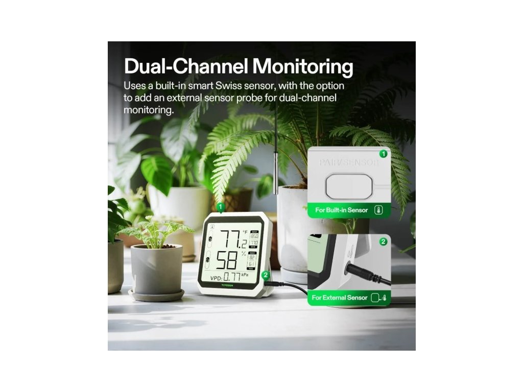 Přístroj podporuje duální kanálové monitorování pomocí integrovaného senzoru a externí sondy, což umožňuje současné měření ve dvou různých místech. Externí sonda je vhodná zejména pro monitorování obtížně dostupných prostor, jako jsou pěstební stany. Aktuální hodnoty teploty a vlhkosti jsou přehledně zobrazeny na LCD displeji v reálném čase.