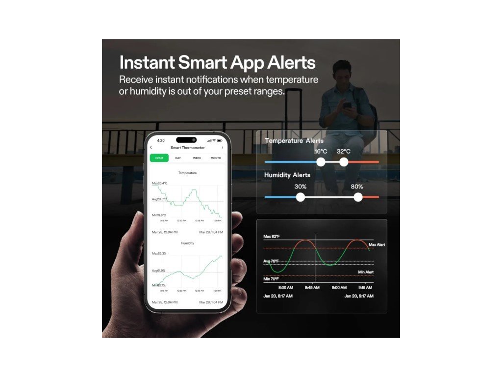 Aplikace VIVOSUN umožňuje nastavení upozornění na kritické hodnoty, ukládání historických dat, jejich analýzu a export pro další zpracování. Díky kompaktním rozměrům, snadné instalaci a bateriovému napájení je zařízení vhodné pro použití v pěstebních stanech, sklenících a indoor prostorech.