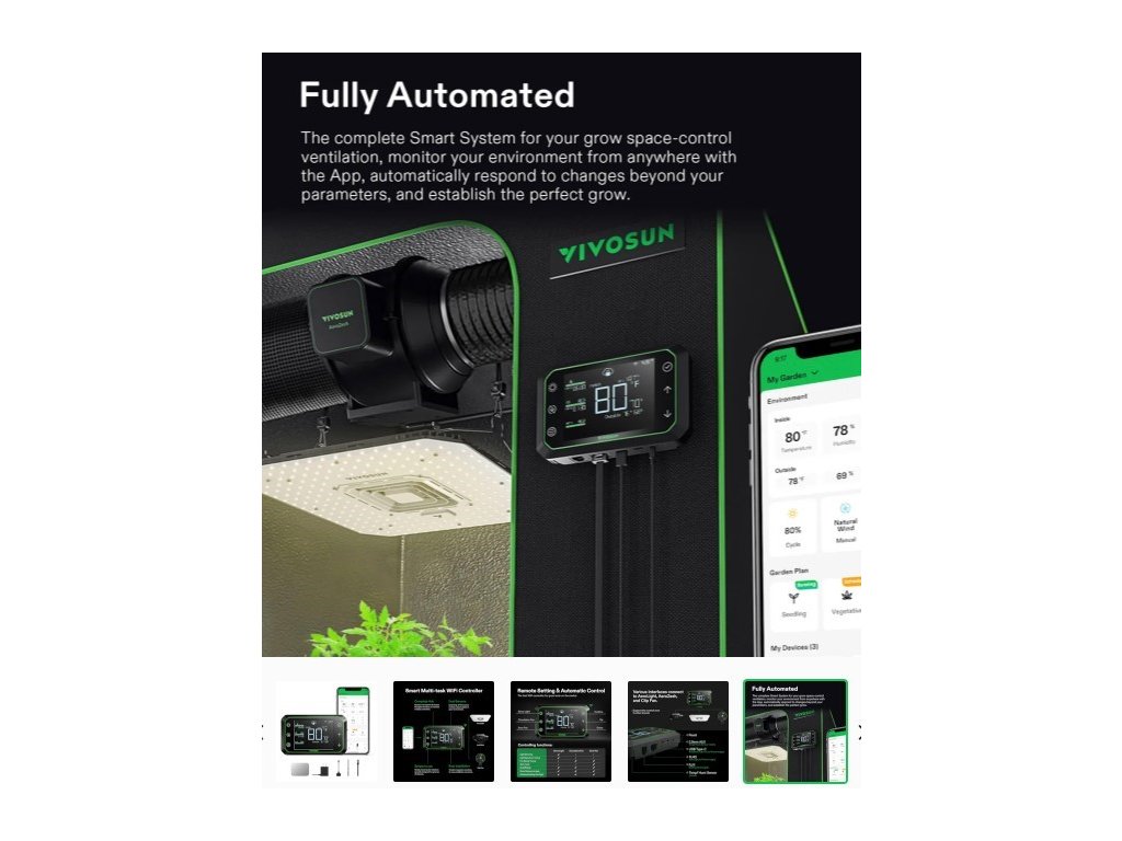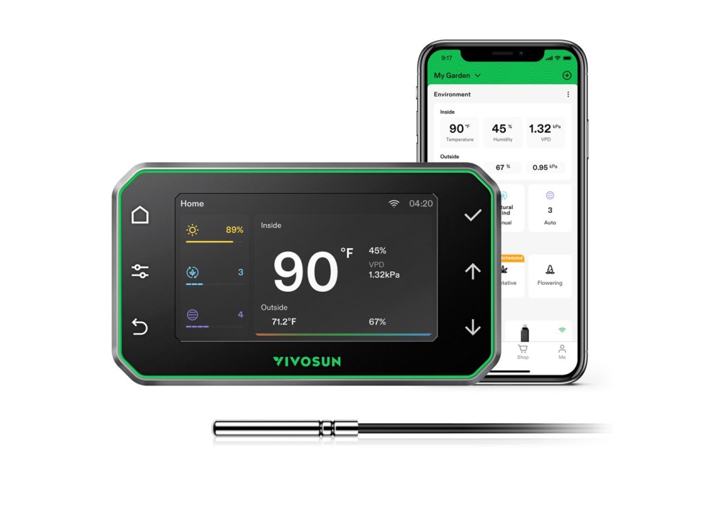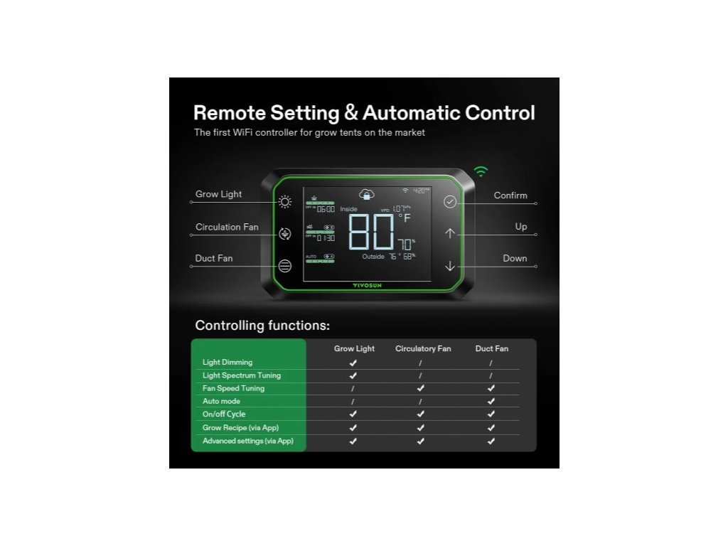 Kontroler je vybaven duálním senzorem teploty a vlhkosti – jedním integrovaným přímo v jednotce a druhým externím na kabelu, který umožňuje přesné sledování podmínek uvnitř i vně pěstebního prostoru. Přehledný LCD displej s jasným zobrazením a šesti kapacitními tlačítky zajišťuje intuitivní ovládání přímo na zařízení, zatímco aplikace VIVOSUN umožňuje vzdálené řízení odkudkoli.
