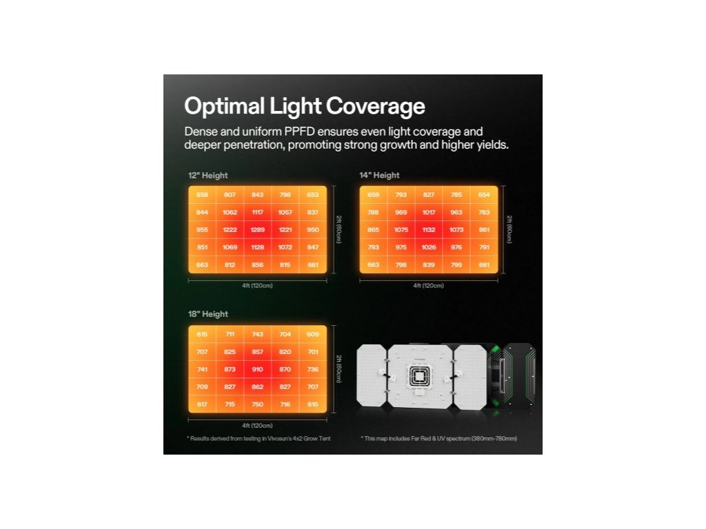 Wing design zajišťuje efektivní pokrytí pěstební plochy při minimální spotřebě energie. Světlo pokrývá oblast 120 × 60 cm ve fázi květu nebo 120 × 120 cm ve vegetativní fázi, což jej činí vhodným pro pěstební stany o rozměrech 90 × 90 cm nebo 120 × 60 cm. Samostatné ovládání spektra umožňuje používání bez nutnosti dalších řídicích zařízení.