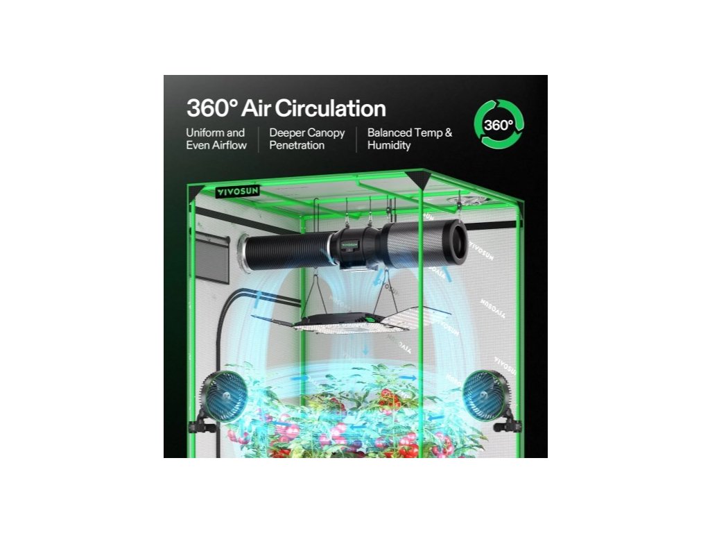 Světlo je vybaveno integrovaným cirkulačním ventilátorem, který zlepšuje proudění vzduchu a pomáhá odvádět teplo z okolí rostlin. Funkce stmívání v rozsahu 25–100 % umožňuje přesnou regulaci intenzity osvětlení podle potřeb různých druhů rostlin. Kompaktní profil s výškou pouhých 5,8 cm šetří prostor v pěstebních stanech a usnadňuje instalaci.