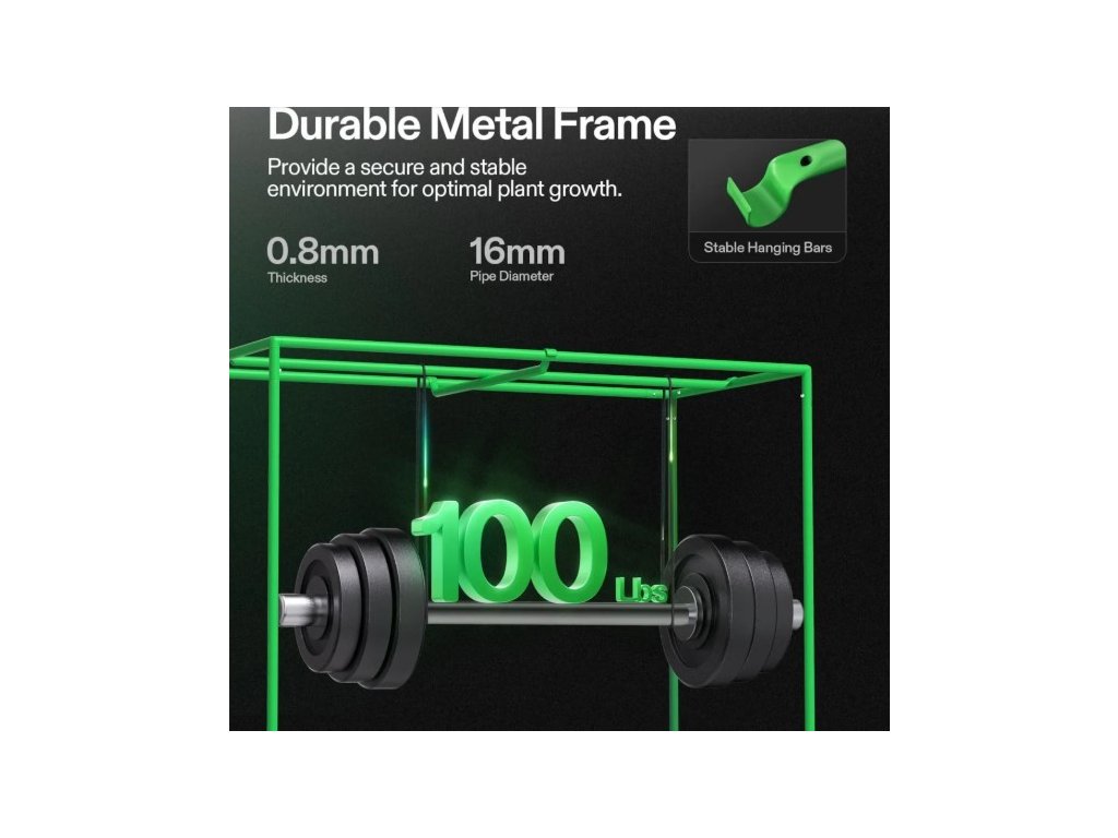 Konstrukce je tvořena stabilním kovovým rámem s tyčemi o průměru 16 mm a nosností až 45,4 kg, což umožňuje bezpečné zavěšení osvětlení, filtru i ventilátoru. Velké čelní dveře spolu s průhledovým oknem umožňují rychlou kontrolu pěstebního prostoru bez narušení vnitřního klimatu. Vyjímatelná záchytná vana navíc usnadňuje čištění a údržbu.