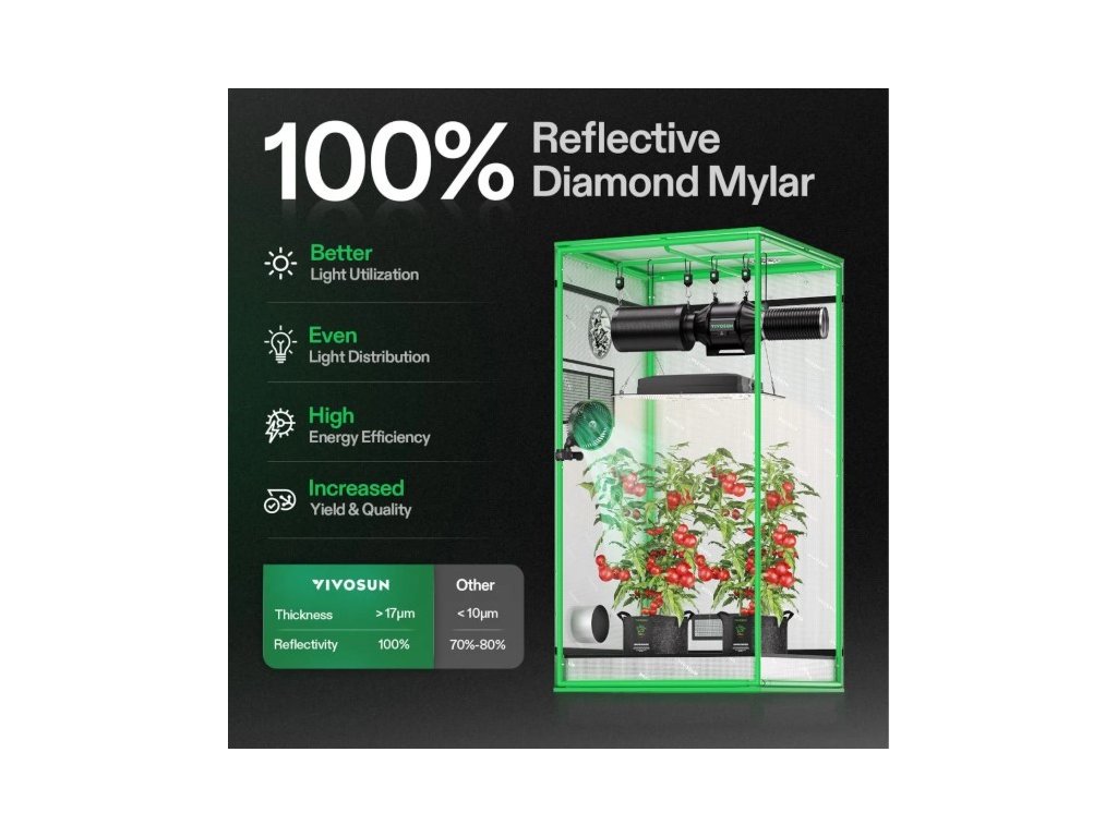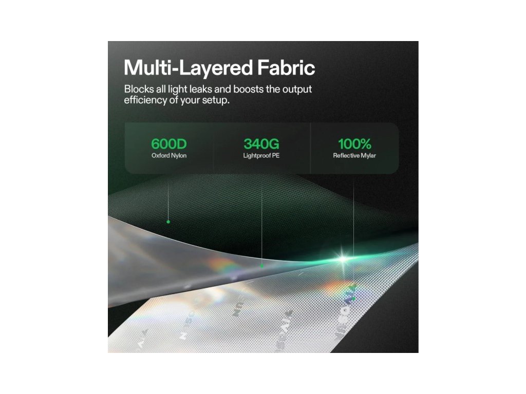 Vnější plášť stanu je vyroben z odolné 600D Oxford tkaniny, která je neprůsvitná a odolná proti roztržení. Vnitřní strana je opatřena 100% reflexní Mylar fólií, která efektivně odráží světlo a pomáhá maximálně využít výkon pěstebního osvětlení.