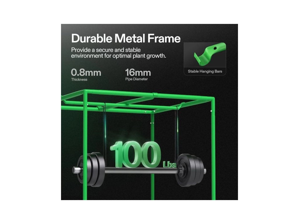 Konstrukce stanu je tvořena stabilním ocelovým rámem s tyčemi o průměru 16 mm a nabízí nosnost až 45,3 kg. Bezpečně tak unese běžné pěstební vybavení, jako jsou světla a filtrace. Velké přední dveře umožňují snadný přístup k rostlinám, zatímco pozorovací okno dovoluje kontrolu vnitřního prostoru bez nutnosti otevírání stanu.