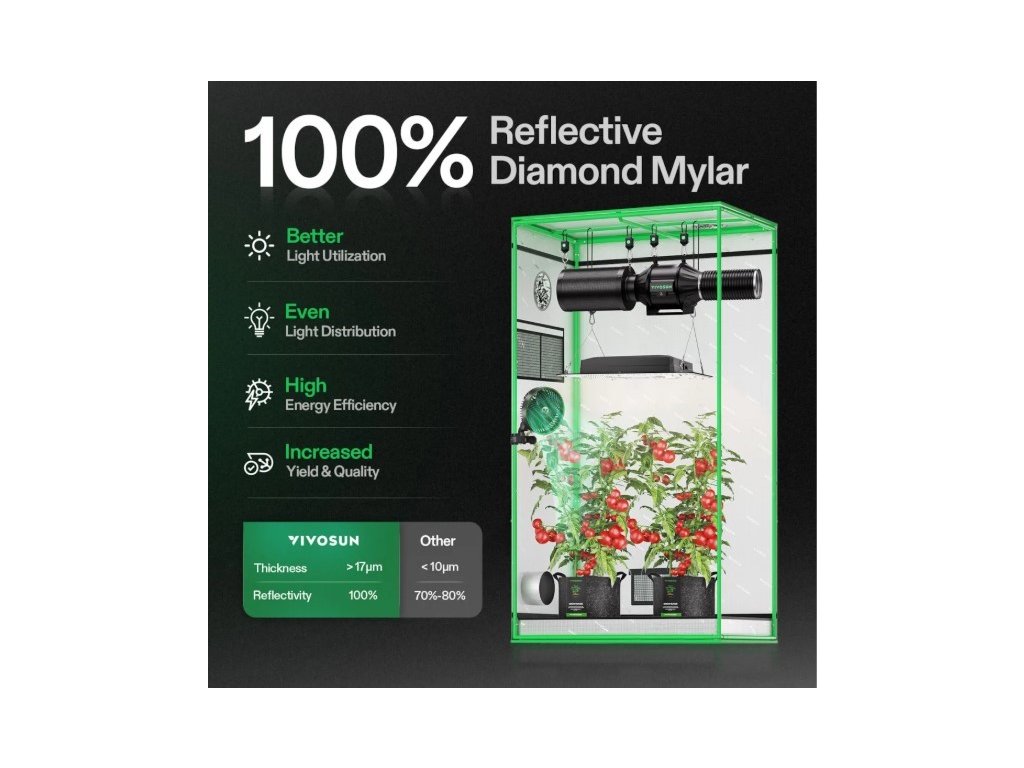 Vnější plášť stanu je vyroben z odolné 600D Oxford tkaniny se zesílenou PE vrstvou, která zajišťuje vysokou pevnost a spolehlivou světelotěsnost. Vnitřní strana je opatřena 100% reflexní Mylar fólií, která odráží světlo zpět k rostlinám a zvyšuje účinnost osvětlení.